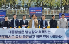 감사로 털고 주인 바꾸고 압수수색으로 겁 주고 돈줄 죄고… 윤석열 정부의 ‘언론 장악’ 어디까지? ▲지난 5월 30일 MBC 뉴스룸 압수수색을 시도하는 경찰에게 MBC노조, MBC기자회, MBC영상기자회가 항의하고 있다. 검찰 수사와 감사원 감사도 모자라 임...Date2023.06.29 Views709